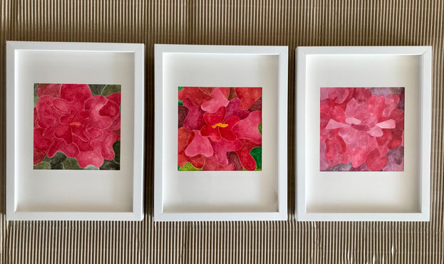 Marigold I, II and III, Watercolour and Acrylic on Paper, framed 31cmx41cm each.